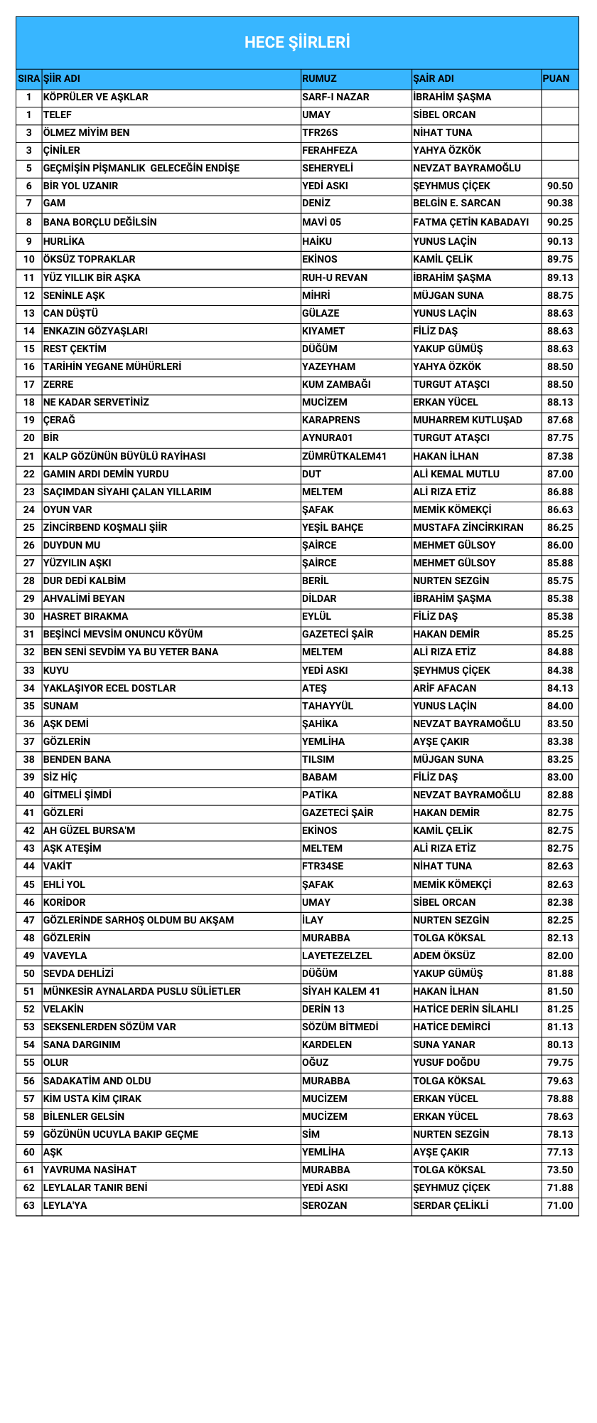 Öyle güzel bir yarışma oldu ki; katılanlara ayrı ayrı teşekkür ediyorum. Büyük bir katılımcı tarafından taltif edildi bu yarışma. En iyisini, en tarafsızını yapmaya çalıştık demeyeceğim, cidden bunu başardık. Yarışmada beklediği Ahbap çavuş ilişkisini bulamadığı ve başka mecralarda olduğu gibi ağam paşam diye karşılanmayan birkaç çürük yumurta dışında bütün katılımcılar bizi anladılar ve sağ olsunlar tebrik ve takdirlerini gerek özel olarak mesajla gerekse yorumlarla ilettiler. Sonuçlar açıklandı puanlar açıklandı. İlk on sıraya girenler elbette belli ve onlara da ilk 3 hariç sıralamaları yakında açıklanacak. Ben bu yarışmaya Büyük emeği geçen başta eser sahipleri siz değerli Şair dostlar olmak üzere hiç bir maddi beklentisi olmadan aylarca bu işin en namuslu en ahlaklı ve en dürüst şekilde yapan Jüri arkadaşlarım; Ali ALTINLI- Alpaslan DURMA- Erman ÖCAL - Gaffar GÜLLÜ -Havva KESKİN - Samim İĞDE - Savaş KOÇ - Yunus KARA ve bu yarışmanın bütün yükünü sırtlanan çok değerli şair dostum ve ŞİİRBAZ YAYINEVİ YÖNETİM KURULU BAŞKAN YARDIMCISI ; Dr. S.Ozan USLU'YA teşekkürlerimi bir borç bilirim...