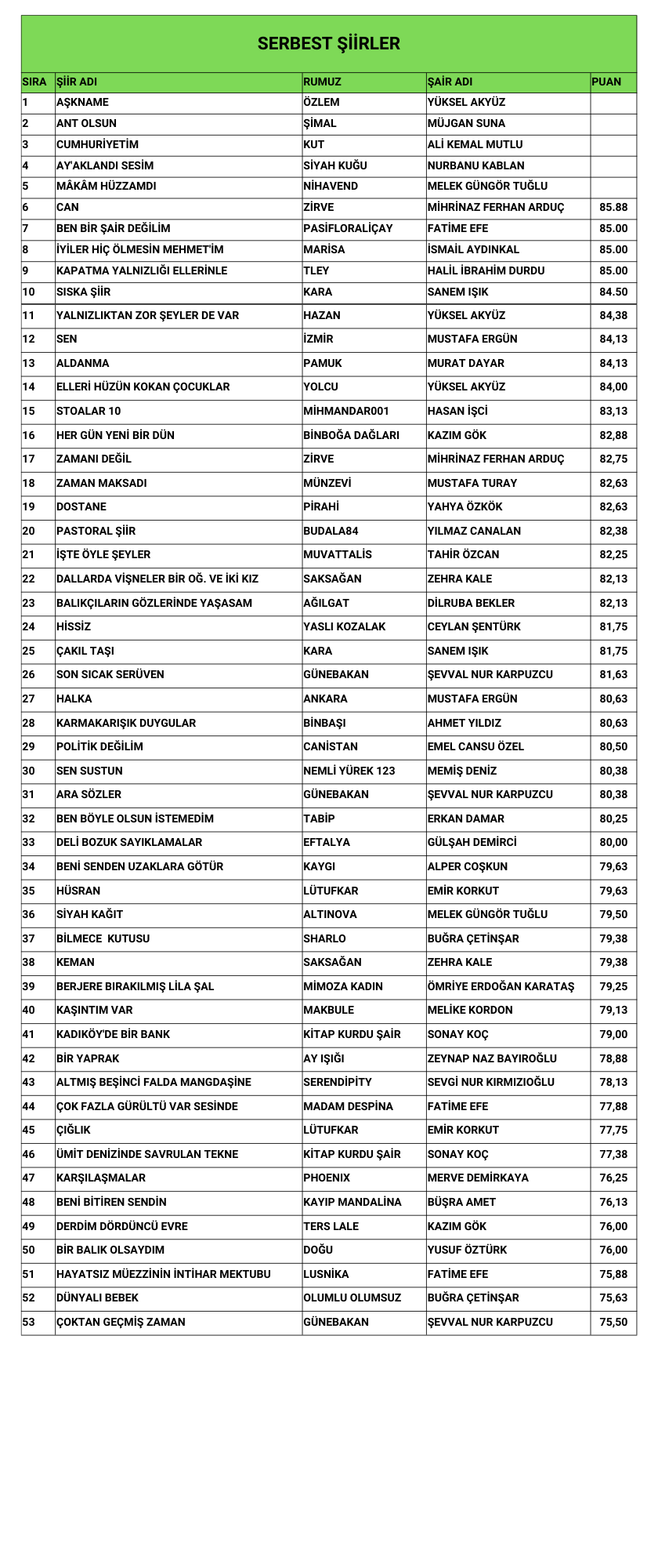 İlklerimin arasına bir ilk daha eklendi sayenizde. İlk kez bir şiir yarışmasına girdim ve son tahlilde serbest katagoride ilk ona bile girdim, bu bana büyük mutluluk vermekle beraber on kıymetli jüri üyesi hocalarımızı düşündüm toplam sayısını bilemediğim bir sürü diye nitelendireceğim şiirleri tek tek okumak derecelendirmek aylarca şiirler bölünmüş saatler geçirmek çok zahmetli ve büyük özveri, adaletli ayrıştırma gerektiren büyük çaba. Emeklerinize, özverinize, bilgilerinize sağlık